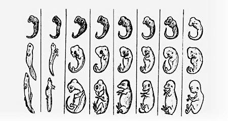 Embryons classés, par ordre d’apparition sur notre planète : poisson, grenouille, tortue, oiseau, vache, singe, homme.